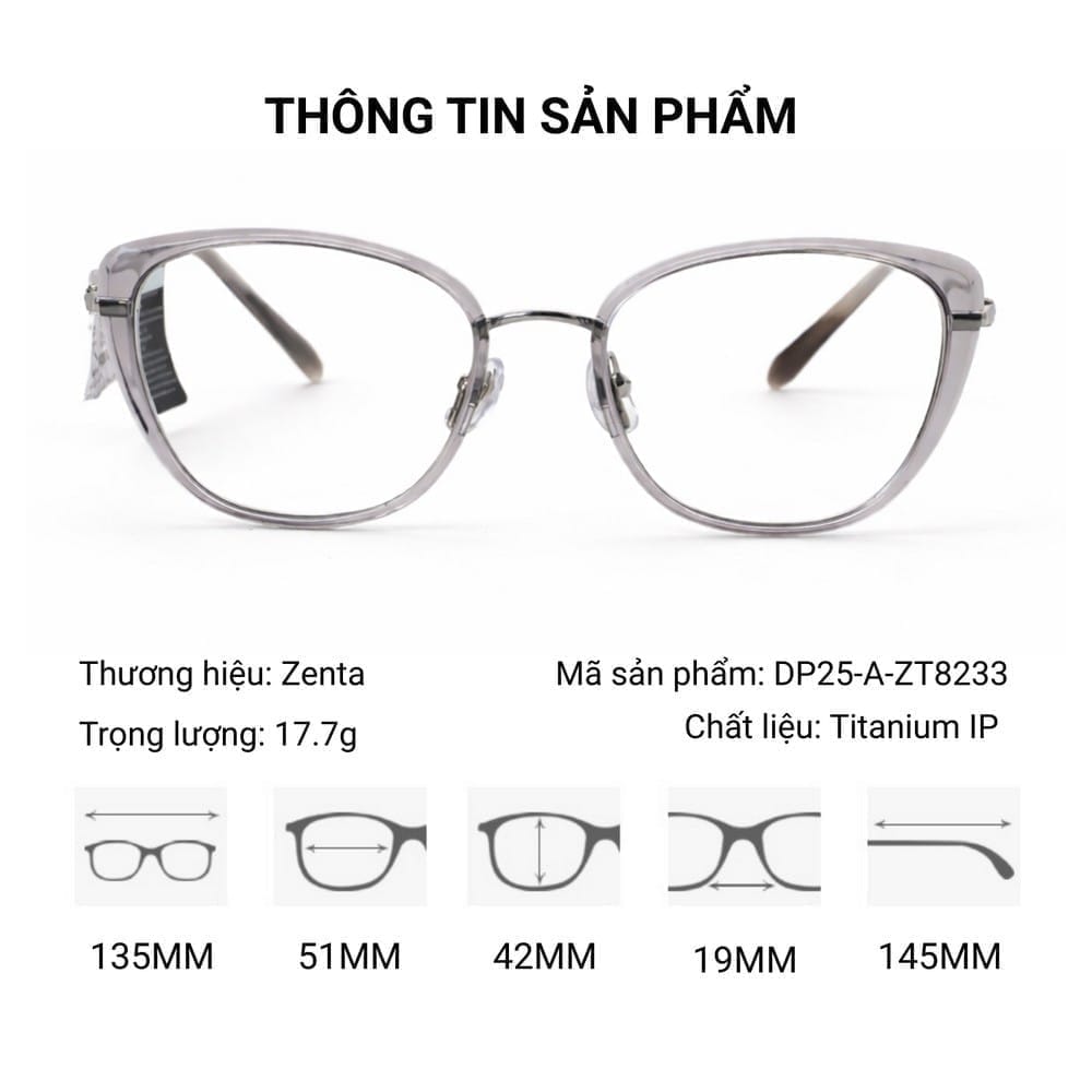Zenta DP25-A-ZT8233 là mẫu gọng kính mắt mèo phù hợp cho người tìm kiếm sự nhẹ nhàng, thoải mái và tính ứng dụng cao. Thiết kế tinh tế kết hợp chất liệu Titanium IP bền nhẹ giúp sản phẩm trở thành lựa chọn đáng cân nhắc cho nhu cầu sử dụng lâu dài.