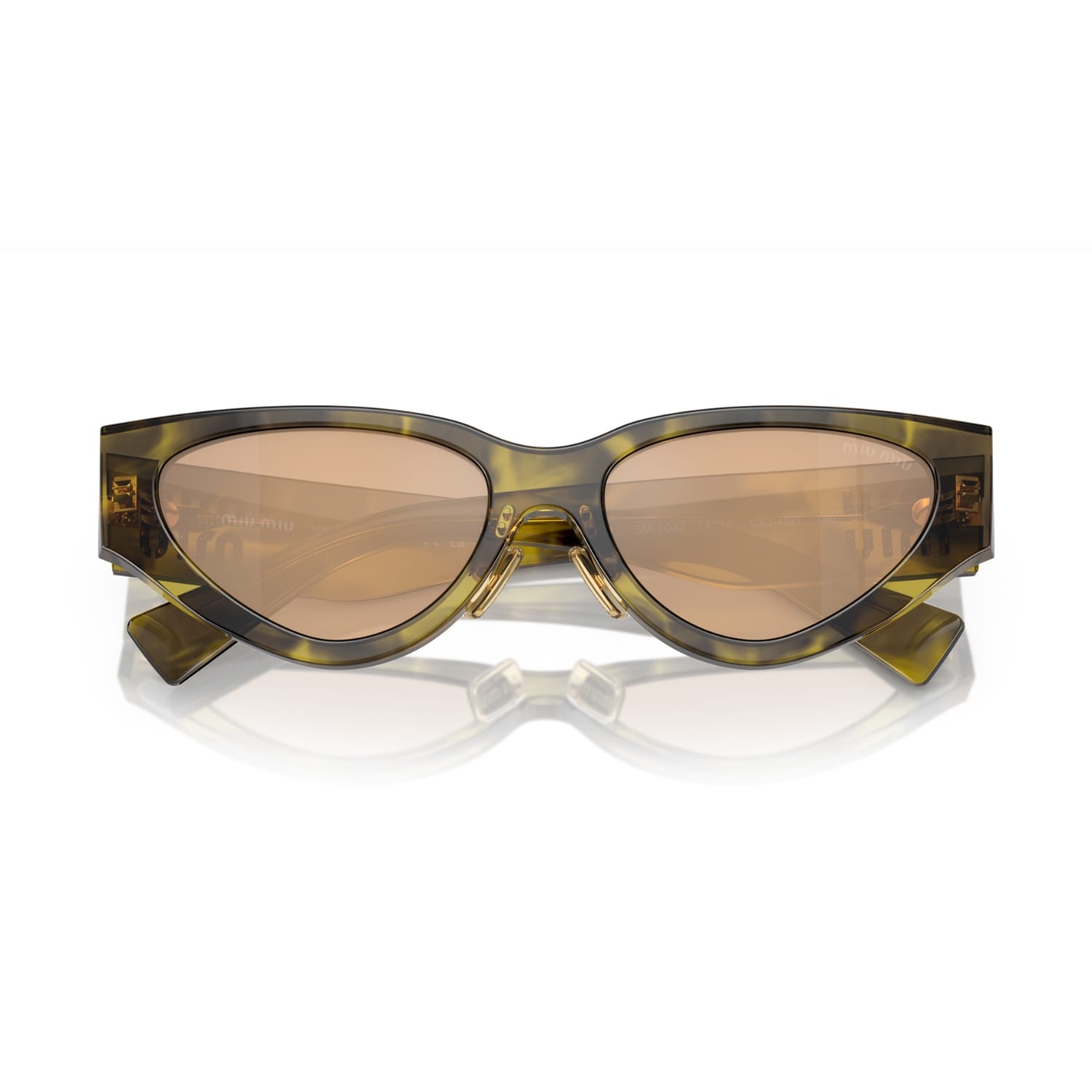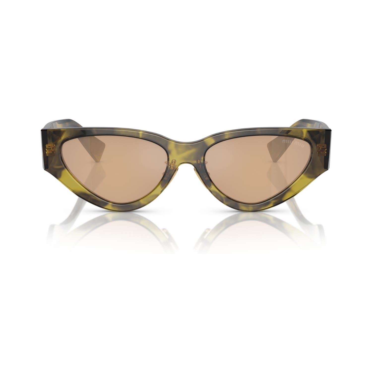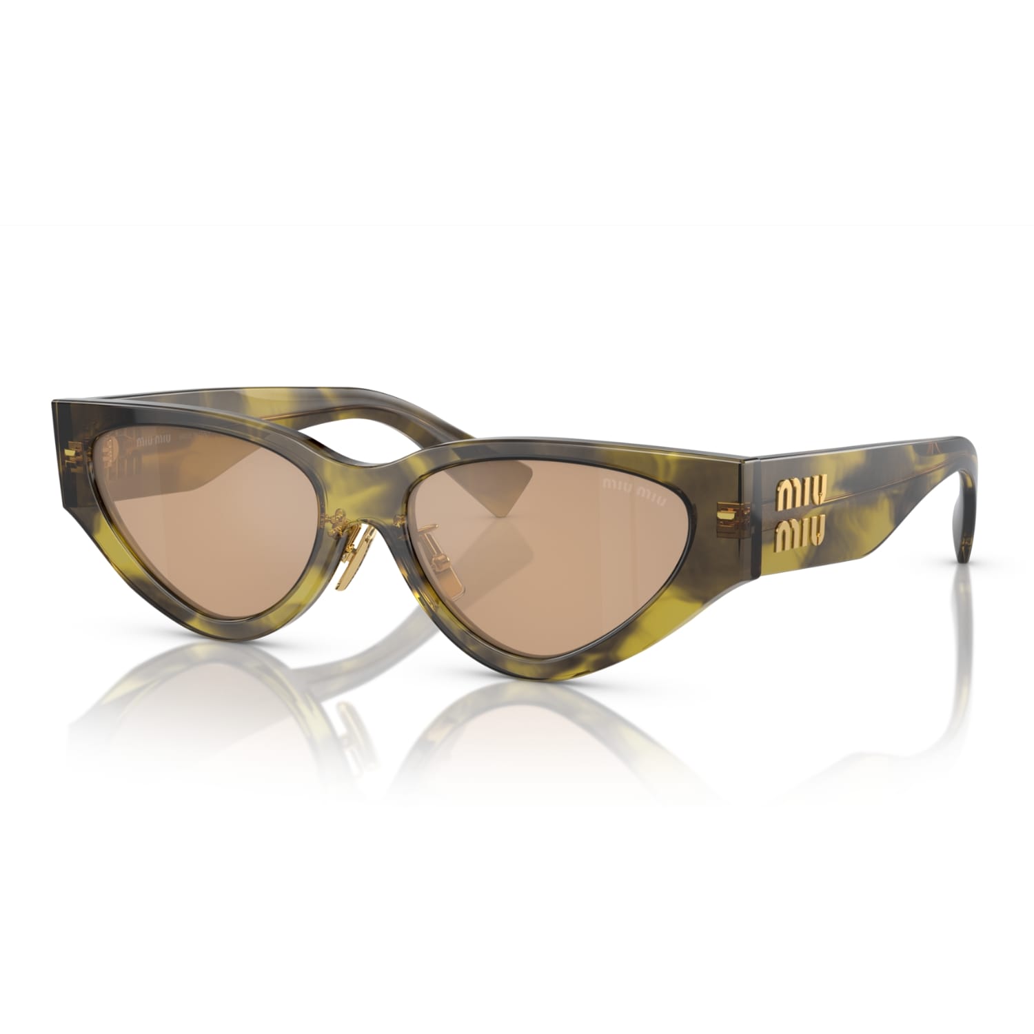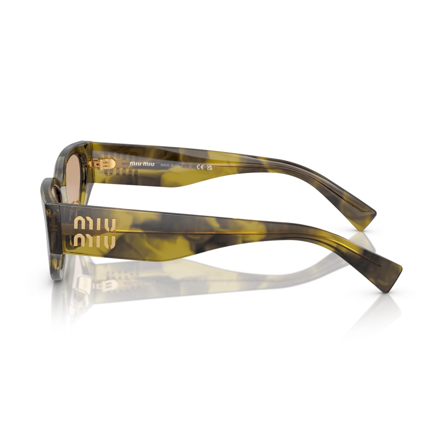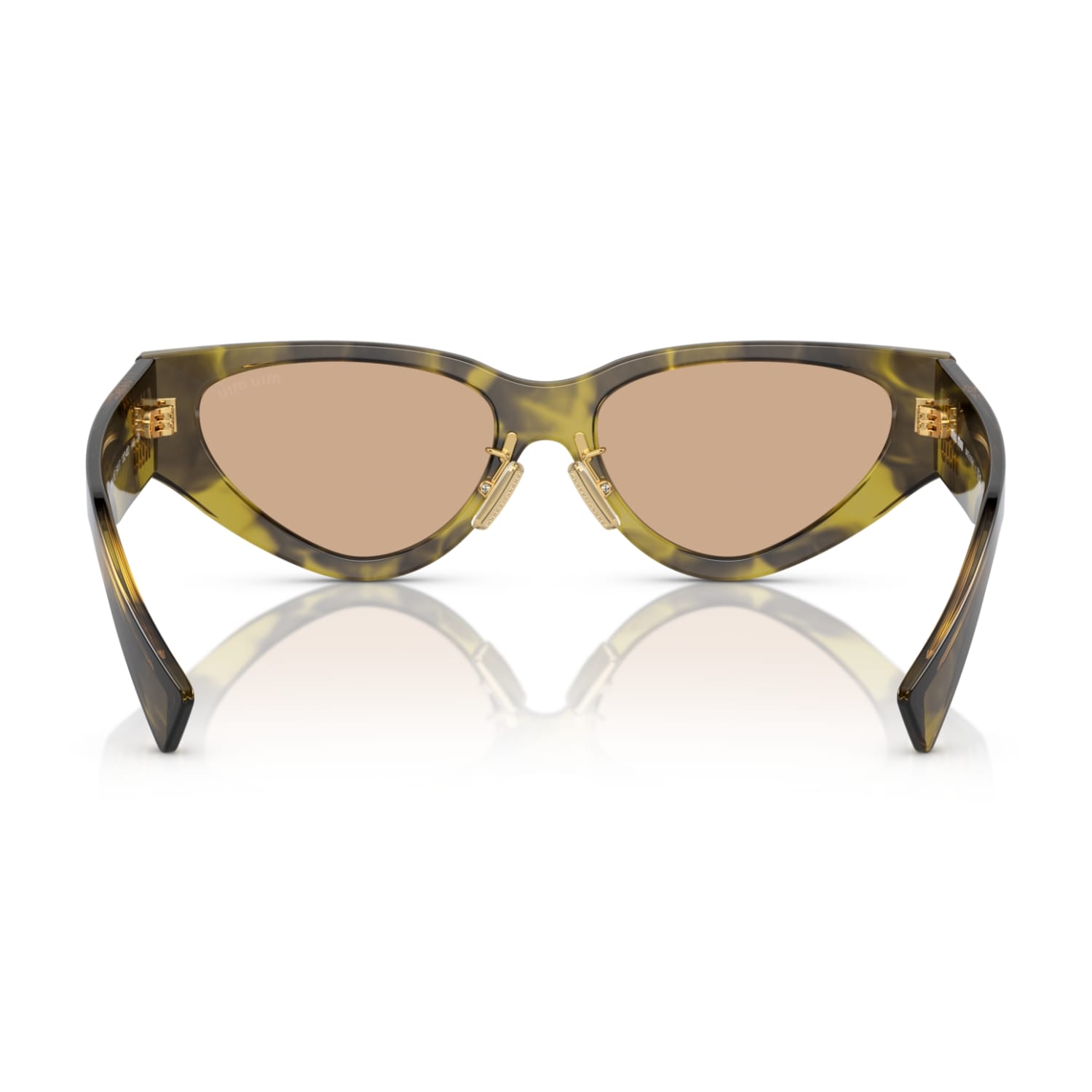 Phần càng kính dày được nhấn mạnh bằng logo Miu Miu kim loại dọc màu vàng bóng, đồng thời đóng vai trò như chi tiết bản lề. Thiết kế này không chỉ mang tính thẩm mỹ cao mà còn thể hiện rõ DNA thời trang của Miu Miu: sang trọng, khác biệt và không thể nhầm lẫn.