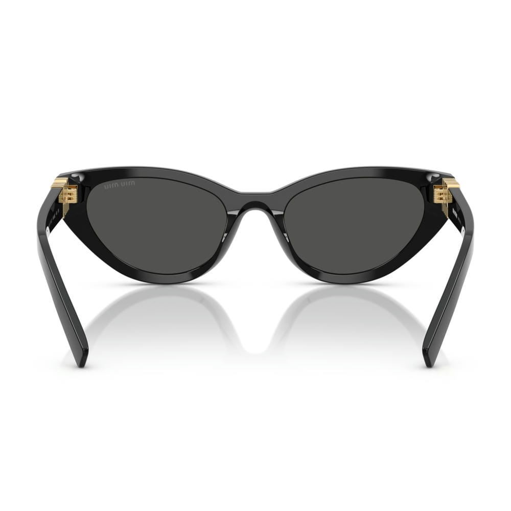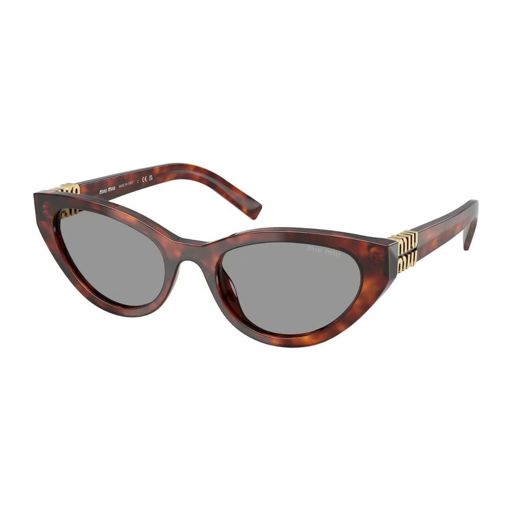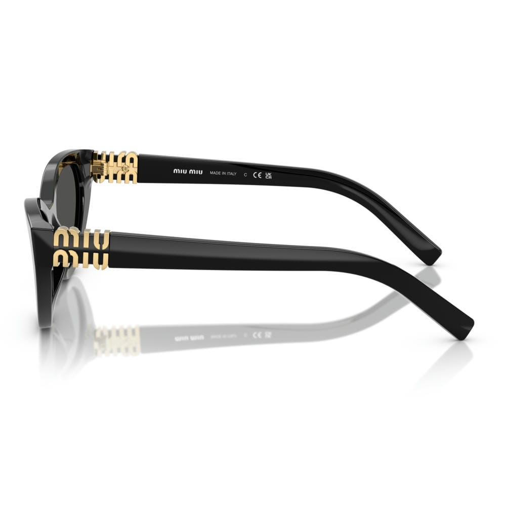 Điểm nhấn đặc biệt nằm ở logo Miu Miu kim loại dạng dọc, vừa là chi tiết nhận diện thương hiệu, vừa đóng vai trò như một phần của bản lề – tinh tế nhưng không thể nhầm lẫn. Đây chính là dấu ấn thiết kế giúp mẫu kính này trở nên khác biệt so với các dòng kính mắt mèo thông thường.